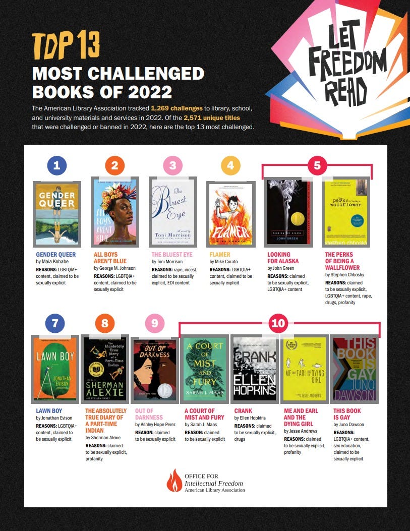 These factors are enough to make one skeptical, but still, I will give them the benefit of the doubt. Let’s look at the ALA’s list of the “Top 13 Most Challenged Books of 2022” and “Let Freedom Read” as their cutesy slogan says.