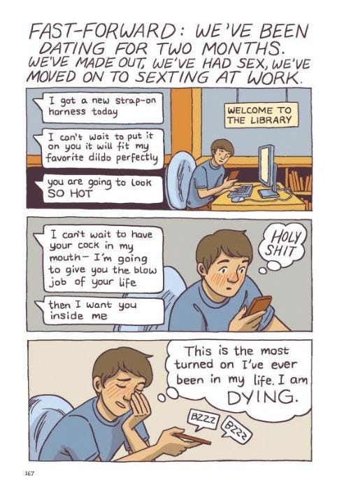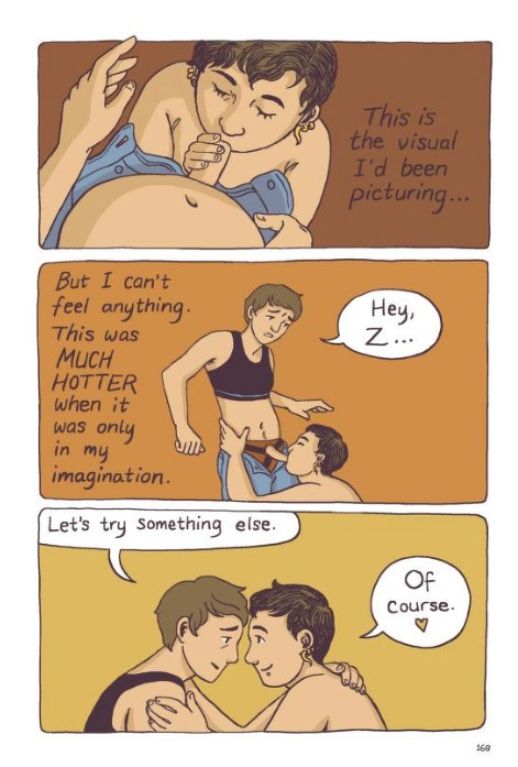 So, it turns out things can get worse. A lot worse, in fact. This “book” has become infamous as of late, and you’ll see why soon. And I use scare quotes for “book” because it’s a graphic novel, and I don’t know about you, but I don’t remember when Watchmen and Frank Miller Batman comics became required reading in schools, but I digress. This glorified comic book is chock full of rather inappropriate and gratuitous sexual scenes. Because this is by far the worst one of these books, I am going to show some pages of this graphic novel (which is available for free online). I didn’t show the scenes from the other graphic novel, as those featured children, but seeing as these feature adults, I’m going to show them as they need to be seen to be believed.